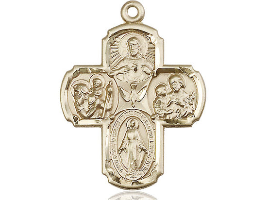 Embrace your faith with timeless elegance. This exquisite 14KT Gold 4-Way Pendant, measuring 1 3/8 x 1, is meticulously handcrafted in the USA by Bliss, a renowned name in religious jewelry. The durable -inch 14KT Gold curb chain gracefully drapes with a secure lobster clasp for a comfortable, everyday wear.
