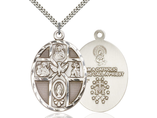Embrace your faith with timeless elegance. This exquisite Sterling Silver 5-Way / Holy Spirit Necklace, measuring 1 7/8 x 1 1/4, is meticulously handcrafted in the USA by Bliss, a renowned name in religious jewelry. The durable 24-inch Sterling Silver curb chain gracefully drapes with a secure lobster clasp for a comfortable, everyday wear.