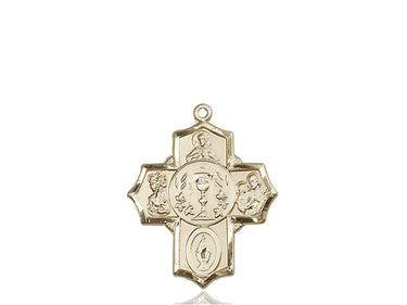 Embrace your faith with timeless elegance. This exquisite 14KT Gold 5-Way Pendant, measuring 1 1/4 x 1, is meticulously handcrafted in the USA by Bliss, a renowned name in religious jewelry. The durable -inch 14KT Gold curb chain gracefully drapes with a secure lobster clasp for a comfortable, everyday wear.