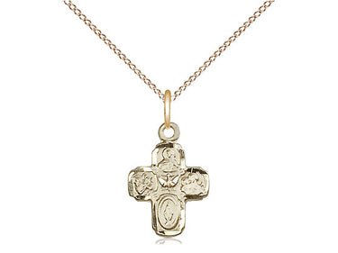 Embrace your faith with timeless elegance. This exquisite Gold Filled 4-Way Necklace, measuring 5/8 x 3/8, is meticulously handcrafted in the USA by Bliss, a renowned name in religious jewelry. The durable 18-inch Gold Filled curb chain gracefully drapes with a secure lobster clasp for a comfortable, everyday wear.