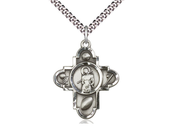Embrace your faith with timeless elegance. This exquisite Sterling Silver Sports 5-Way / St Sebastian Necklace, measuring 1 1/4 x 1, is meticulously handcrafted in the USA by Bliss, a renowned name in religious jewelry. The durable 24-inch Sterling Silver curb chain gracefully drapes with a secure lobster clasp for a comfortable, everyday wear.
