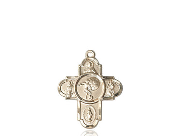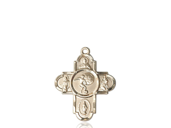 Embrace your faith with timeless elegance. This exquisite 14KT Gold 5-Way / Soccer Pendant, measuring 1 1/8 X 1 5/8, is meticulously handcrafted in the USA by Bliss, a renowned name in religious jewelry. The durable -inch 14KT Gold curb chain gracefully drapes with a secure lobster clasp for a comfortable, everyday wear.