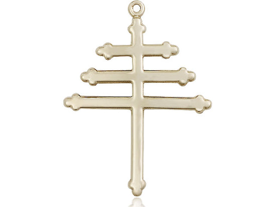 Embrace your faith with timeless elegance. This exquisite 14KT Gold Marionite Cross Pendant, measuring 1 1/2 x 1 1/8, is meticulously handcrafted in the USA by Bliss, a renowned name in religious jewelry. The durable -inch 14KT Gold curb chain gracefully drapes with a secure lobster clasp for a comfortable, everyday wear.