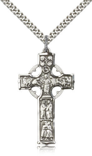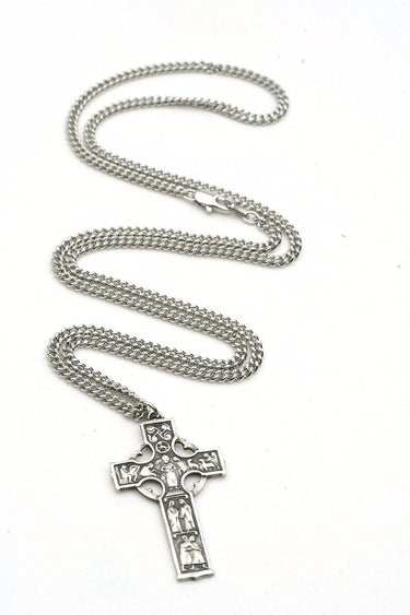 Embrace your faith with timeless elegance. This exquisite Sterling Silver Celtic Cross Necklace, measuring 1 5/8 x 7/8, is meticulously handcrafted in the USA by Bliss, a renowned name in religious jewelry. The durable 24-inch Sterling Silver curb chain gracefully drapes with a secure lobster clasp for a comfortable, everyday wear.
