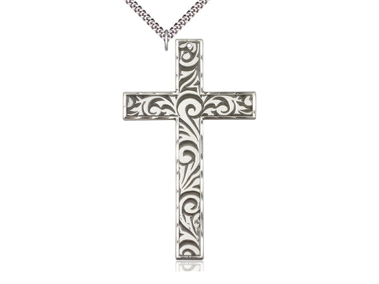 Embrace your faith with timeless elegance. This exquisite Sterling Silver Knurled Cross Necklace, measuring 3 X 1 3/4, is meticulously handcrafted in the USA by Bliss, a renowned name in religious jewelry. The durable 24-inch Sterling Silver curb chain gracefully drapes with a secure lobster clasp for a comfortable, everyday wear.
