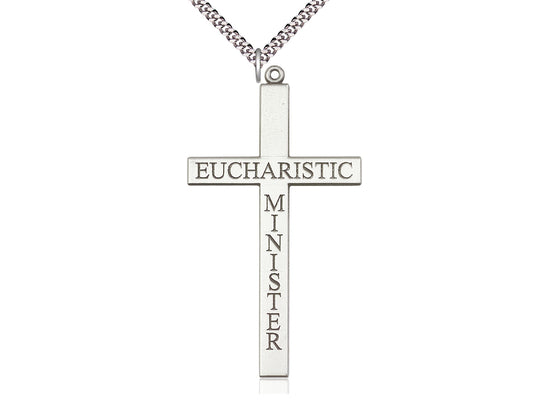 Embrace your faith with timeless elegance. This exquisite Sterling Silver Eucharistic Minister Cross Necklace, measuring 2 5/8 X 1 3/8, is meticulously handcrafted in the USA by Bliss, a renowned name in religious jewelry. The durable 24-inch Sterling Silver curb chain gracefully drapes with a secure lobster clasp for a comfortable, everyday wear.