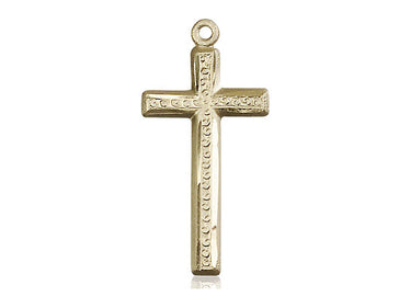 Embrace your faith with timeless elegance. This exquisite 14KT Gold Cross Pendant, measuring 1 1/8 x 1/2, is meticulously handcrafted in the USA by Bliss, a renowned name in religious jewelry. The durable -inch 14KT Gold curb chain gracefully drapes with a secure lobster clasp for a comfortable, everyday wear.