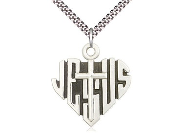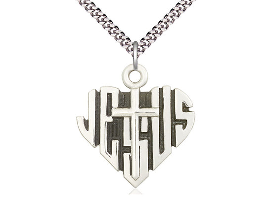 Sterling Silver Heart of Jesus / Cross Pendant Necklace 1 1/8 x 1 1/8 - 24 Inch Chain