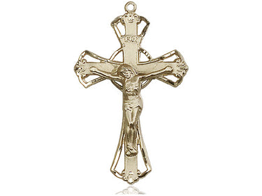 Embrace your faith with timeless elegance. This exquisite 14KT Gold Crucifix Pendant, measuring 1 1/4 x 3/4, is meticulously handcrafted in the USA by Bliss, a renowned name in religious jewelry. The durable -inch 14KT Gold curb chain gracefully drapes with a secure lobster clasp for a comfortable, everyday wear.