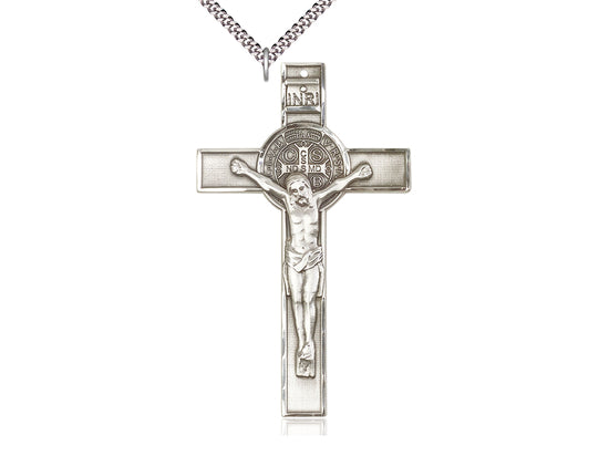 Extra Large Sterling Silver St. Benedict Pendant Necklace 3 X 1 3/4 - 24 Inch Chain