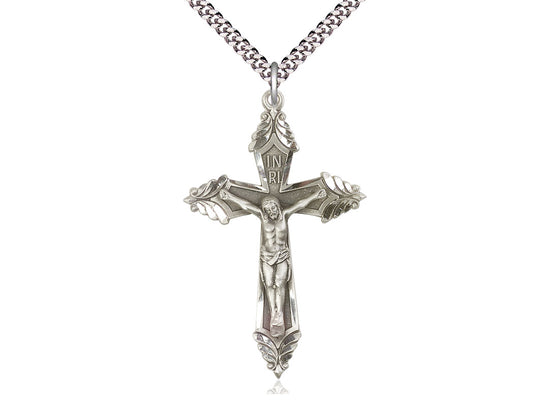 Embrace your faith with timeless elegance. This exquisite Sterling Silver Crucifix Necklace, measuring 1 7/8 X 1 1/8, is meticulously handcrafted in the USA by Bliss, a renowned name in religious jewelry. The durable 24-inch Sterling Silver curb chain gracefully drapes with a secure lobster clasp for a comfortable, everyday wear.