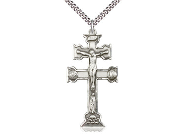 Embrace your faith with timeless elegance. This exquisite Sterling Silver Caravaca Crucifix Necklace, measuring 2 x 1, is meticulously handcrafted in the USA by Bliss, a renowned name in religious jewelry. The durable 24-inch Sterling Silver curb chain gracefully drapes with a secure lobster clasp for a comfortable, everyday wear.