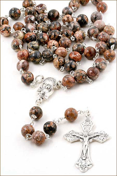 Whether you're seeking a personal prayer companion with unique character or a memorable Catholic gift that stands out, this Leopard Stone rosary combines exotic natural beauty with spiritual significance. The distinctive earth-toned patterns create a meaningful connection to God's creation during your daily devotions.