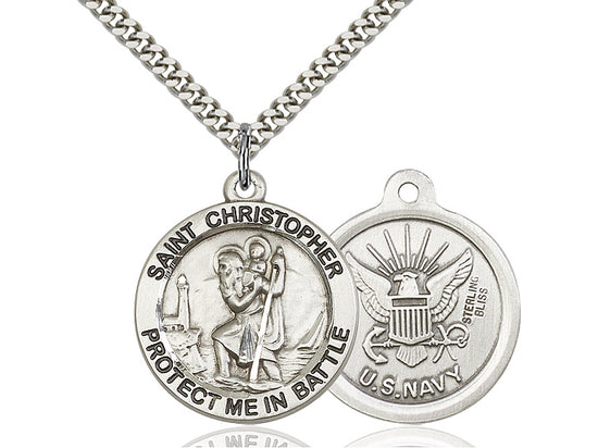 Exquisite Sterling Silver Saint Christopher/Navy Necklace (1 x 1 5/8) on 24 Chain with Lobster Clasp - Handmade in the USA by Bliss