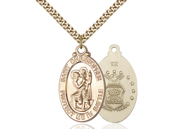 Embrace your faith with timeless elegance. This exquisite Gold Filled Saint Christopher/Air Force Necklace, measuring 1 1/8 x 1 1/4, is meticulously handcrafted in the USA by Bliss, a renowned name in religious jewelry. The durable 24-inch Gold Filled curb chain gracefully drapes with a secure lobster clasp for a comfortable, everyday wear. The Saint Christopher is a patron saint of travelers, motorists.