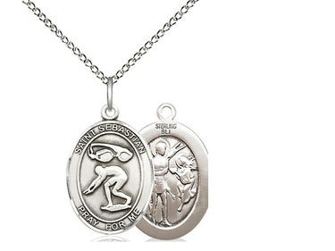 Embrace your faith with timeless elegance. This exquisite Sterling Silver Saint Sebastian / Swimming Necklace, measuring 3/4 x 1/2, is meticulously handcrafted in the USA by Bliss, a renowned name in religious jewelry. The durable 18-inch Sterling Silver curb chain gracefully drapes with a secure lobster clasp for a comfortable, everyday wear. The is a patron saint of athletes, soldiers.