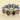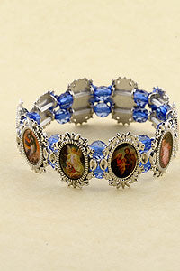 Stretchable bracelet with saint images on metal panels. Two row blue bead dividers between panels.