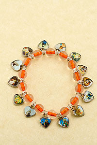 Orange round bead bracelet with heart saints medallions mounted on a stretchable string.