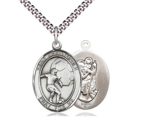 Embrace your faith with timeless elegance. This exquisite Sterling Silver Saint Christopher/Soccer Necklace, measuring 1 x 3/4, is meticulously handcrafted in the USA by Bliss, a renowned name in religious jewelry. The durable 24-inch Sterling Silver curb chain gracefully drapes with a secure lobster clasp for a comfortable, everyday wear. The is a patron saint of travelers, motorists.