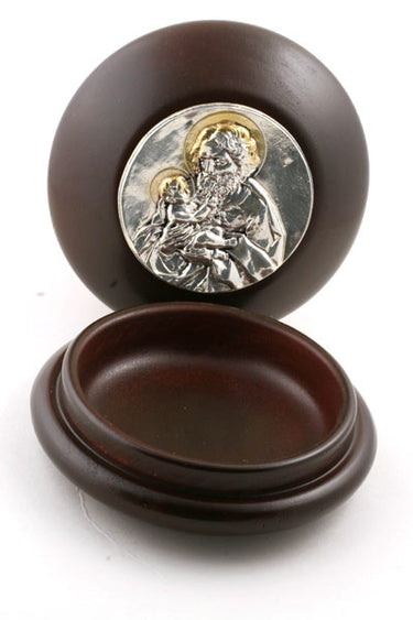 - Icon: Silver-tone St. Joseph emblem on lid