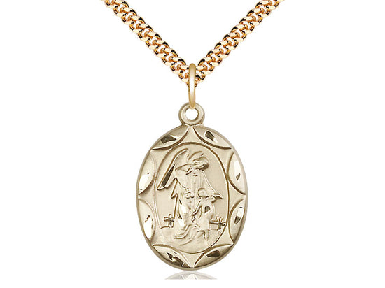 Embrace your faith with timeless elegance. This exquisite Gold Filled Guardian Angel Necklace, measuring 1 x 5/8, is meticulously handcrafted in the USA by Bliss, a renowned name in religious jewelry. The durable 24-inch Gold Filled curb chain gracefully drapes with a secure lobster clasp for a comfortable, everyday wear.