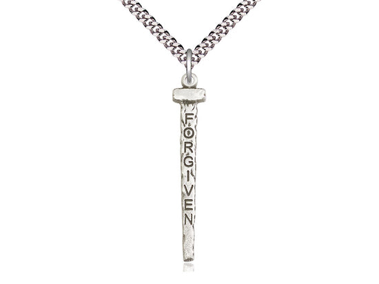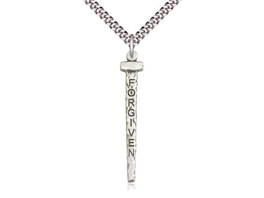 Embrace your faith with timeless elegance. This exquisite Sterling Silver Forgiven Nail Necklace, measuring 1 1/2 X 1/4, is meticulously handcrafted in the USA by Bliss, a renowned name in religious jewelry. The durable 24-inch Sterling Silver curb chain gracefully drapes with a secure lobster clasp for a comfortable, everyday wear.