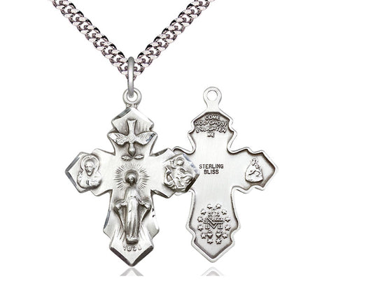 Embrace your faith with timeless elegance. This exquisite Sterling Silver 4-Way Necklace, measuring 1 1/4 x 7/8, is meticulously handcrafted in the USA by Bliss, a renowned name in religious jewelry. The durable 24-inch Sterling Silver curb chain gracefully drapes with a secure lobster clasp for a comfortable, everyday wear.