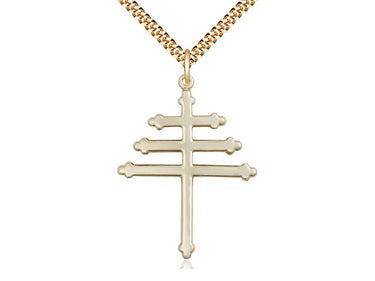 Embrace your faith with timeless elegance. This exquisite Gold Filled Marionite Cross Necklace, measuring 1 1/2 x 1 1/8, is meticulously handcrafted in the USA by Bliss, a renowned name in religious jewelry. The durable 24-inch Gold Filled curb chain gracefully drapes with a secure lobster clasp for a comfortable, everyday wear.