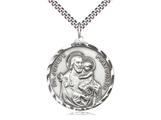 Large Sterling Silver St. Joseph Pendant Necklace 1 3/8 x 1 1/8 - 24 Inch Chain