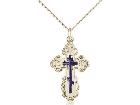Embrace your faith with timeless elegance. This exquisite Gold Filled Saint Olga Cross Necklace, measuring 1 1/8 x 5/8, is meticulously handcrafted in the USA by Bliss, a renowned name in religious jewelry. The durable 18-inch Gold Filled curb chain gracefully drapes with a secure lobster clasp for a comfortable, everyday wear.