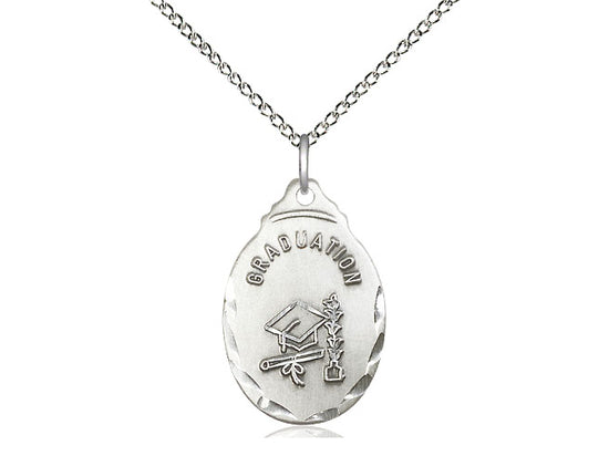 Embrace your faith with timeless elegance. This exquisite Sterling Silver Graduate Necklace, measuring 7/8 x 1/2, is meticulously handcrafted in the USA by Bliss, a renowned name in religious jewelry. The durable 18-inch Sterling Silver curb chain gracefully drapes with a secure lobster clasp for a comfortable, everyday wear.