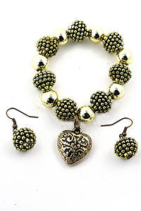 Acrylic bead bracelet and earring gift set. Bead size: 12mm. Heart charm and beads mounted on stretchable string.