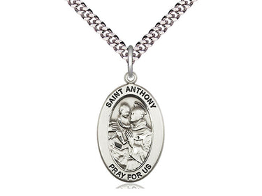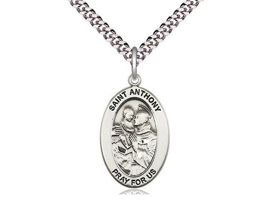 Embrace your faith with timeless elegance. This exquisite Sterling Silver Saint Anthony of Padua Necklace, measuring 1 x 1/2, is meticulously handcrafted in the USA by Bliss, a renowned name in religious jewelry. The durable 24-inch Sterling Silver curb chain gracefully drapes with a secure lobster clasp for a comfortable, everyday wear. The Saint Anthony of Padua is a patron saint of lost articles, the poor.