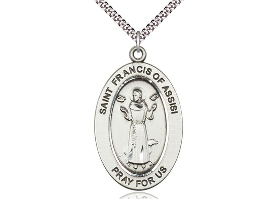 Embrace your faith with timeless elegance. This exquisite Sterling Silver Saint Francis of Assisi Necklace, measuring 1 x 1/2, is meticulously handcrafted in the USA by Bliss, a renowned name in religious jewelry. The durable 24-inch Sterling Silver curb chain gracefully drapes with a secure lobster clasp for a comfortable, everyday wear. The Saint Francis of Assisi is a patron saint of animals, catholic action.