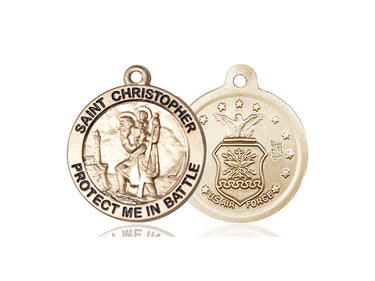Embrace your faith with timeless elegance. This exquisite 14KT Gold Saint Christopher/Air Force Pendant, measuring 1 x 1 5/8, is meticulously handcrafted in the USA by Bliss, a renowned name in religious jewelry. The durable -inch 14KT Gold curb chain gracefully drapes with a secure lobster clasp for a comfortable, everyday wear. The Saint Christopher is a patron saint of travelers, motorists.