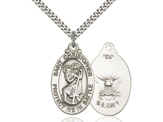 Embrace your faith with timeless elegance. This exquisite Sterling Silver Saint Christopher/Navy Necklace, measuring 1 1/8 x 1 1/4, is meticulously handcrafted in the USA by Bliss, a renowned name in religious jewelry. The durable 24-inch Sterling Silver curb chain gracefully drapes with a secure lobster clasp for a comfortable, everyday wear. The Saint Christopher is a patron saint of travelers, motorists.