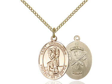 Embrace your faith with timeless elegance. This exquisite Gold Filled Saint Christopher/Nat'l Guard Necklace, measuring 3/4 x 1, is meticulously handcrafted in the USA by Bliss, a renowned name in religious jewelry. The durable 18-inch Gold Filled curb chain gracefully drapes with a secure lobster clasp for a comfortable, everyday wear. The Saint Christopher is a patron saint of travelers, motorists.