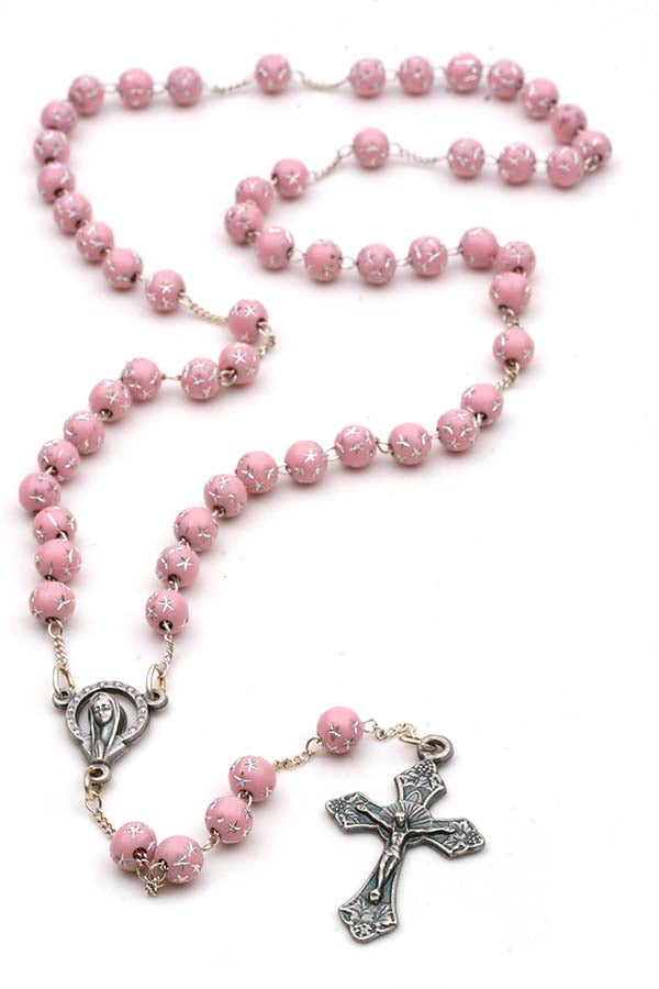 Cute rosary beads for girls with pink plastic beads. Each 5mm bead shows silver stars.Total length: 15". Pewter center piece and crucifix. Comes boxed. Made in Brazil.