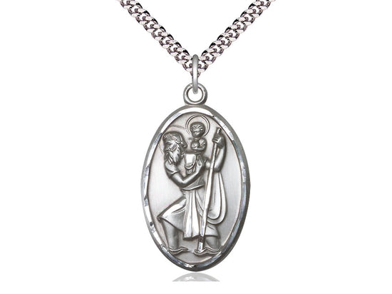 Large Sterling Silver St. Christopher Pendant Necklace 1 3/8 x 3/4 - 24 Inch Chain