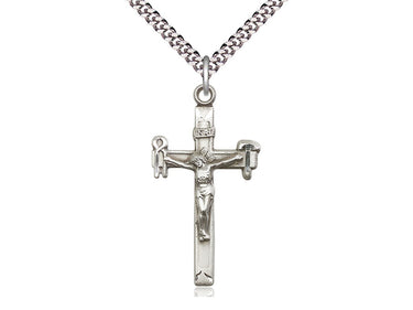 Embrace your faith with timeless elegance. This exquisite Sterling Silver Crucifix Necklace, measuring 1 3/8 x 3/4, is meticulously handcrafted in the USA by Bliss, a renowned name in religious jewelry. The durable 24-inch Sterling Silver curb chain gracefully drapes with a secure lobster clasp for a comfortable, everyday wear.