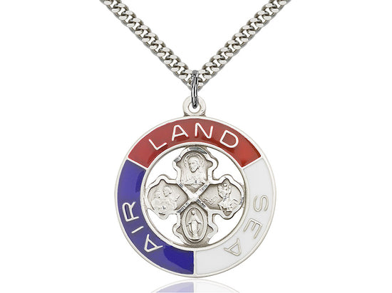 Embrace your faith with timeless elegance. This exquisite Sterling Silver Land, Sea, Air Necklace, measuring 1 3/8 x 1 1/8, is meticulously handcrafted in the USA by Bliss, a renowned name in religious jewelry. The durable 24-inch Sterling Silver curb chain gracefully drapes with a secure lobster clasp for a comfortable, everyday wear.