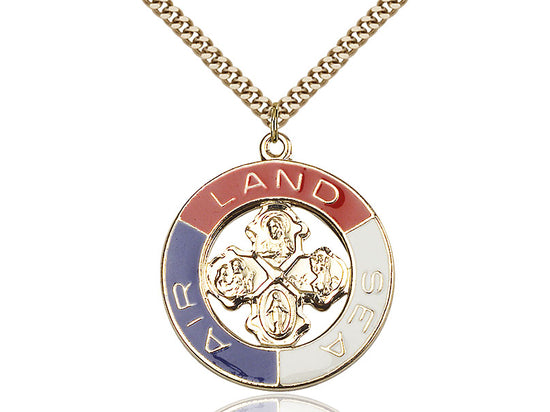 Embrace your faith with timeless elegance. This exquisite Two-Tone Land, Sea, Air Necklace, measuring 1 3/8 x 1 1/8, is meticulously handcrafted in the USA by Bliss, a renowned name in religious jewelry. The durable 24-inch Two-Tone curb chain gracefully drapes with a secure lobster clasp for a comfortable, everyday wear.