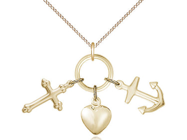 Embrace your faith with timeless elegance. This exquisite Gold Filled Faith, Hope & Charity Necklace, measuring 1 3/8 x 1 5/8, is meticulously handcrafted in the USA by Bliss, a renowned name in religious jewelry. The durable 18-inch Gold Filled curb chain gracefully drapes with a secure lobster clasp for a comfortable, everyday wear.