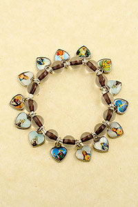 Round bead bracelet with heart saints medallions mounted on a stretchable string.