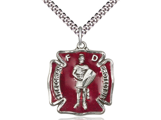 Sterling Silver St. Florian Pendant with Red Epoxy Necklace 1 1/8 x 1 - 24 Inch Chain