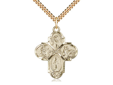 Embrace your faith with timeless elegance. This exquisite Gold Filled 4-Way Necklace, measuring 1 1/4 x 1, is meticulously handcrafted in the USA by Bliss, a renowned name in religious jewelry. The durable 24-inch Gold Filled curb chain gracefully drapes with a secure lobster clasp for a comfortable, everyday wear.