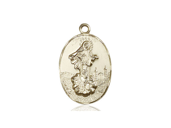Embrace your faith with timeless elegance. This exquisite 14KT Gold Our Lady of Medugorje Pendant, measuring 1 3/8 x 7/8, is meticulously handcrafted in the USA by Bliss, a renowned name in religious jewelry. The durable -inch 14KT Gold curb chain gracefully drapes with a secure lobster clasp for a comfortable, everyday wear.