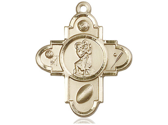 Embrace your faith with timeless elegance. This exquisite 14KT Gold Sports 5-Way / St Christopher Pendant, measuring 1 1/4 x 1, is meticulously handcrafted in the USA by Bliss, a renowned name in religious jewelry. The durable -inch 14KT Gold curb chain gracefully drapes with a secure lobster clasp for a comfortable, everyday wear.