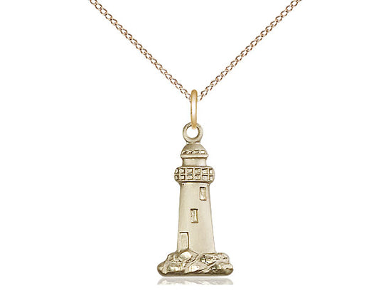 Embrace your faith with timeless elegance. This exquisite Gold Filled Lighthouse Necklace, measuring 3/4 x 3/8, is meticulously handcrafted in the USA by Bliss, a renowned name in religious jewelry. The durable 18-inch Gold Filled curb chain gracefully drapes with a secure lobster clasp for a comfortable, everyday wear.