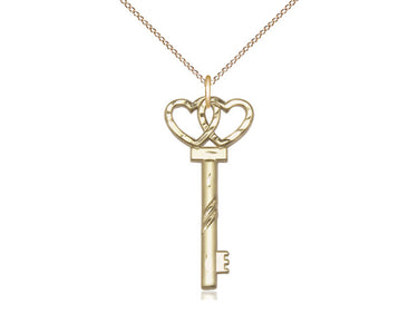 Embrace your faith with timeless elegance. This exquisite Gold Filled Small Key w/Double Hearts Necklace, measuring 1 1/4 X 1/2, is meticulously handcrafted in the USA by Bliss, a renowned name in religious jewelry. The durable 18-inch Gold Filled curb chain gracefully drapes with a secure lobster clasp for a comfortable, everyday wear.